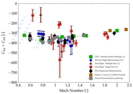 The results of the present wind tunnel measurements are summarized and compared to the CFD and literature data in Figure 10. The data from references [,] are published with a different center of gravity and are thus converted using Equation (5). The coefficients , and required for this conversion are taken from []. The results agree very well with the CFD results presented in reference []. While the free-flight data from reference [] show a large scatter, particularly in the transonic range, the present wind tunnel measurements are generally within the uncertainty range of these results. The agreement with data from a free-flight test campaign at ISL (partly published in reference []) is very good for Mach numbers greater than unity while deviating by approximately 20% at Mach 0.8. The single data point at Mach 2 (test case 20 in Table 1) is slightly lower compared to the wind tunnel tests from reference []. In reference [], the error is given as a percentage of the absolute value for and falls in a range between 10% and 30%. The error bars for the wind tunnel results are calculated using the procedure outlined in Section 4. With a higher number of individual tests, as stated in Table 1, the uncertainties fall in the range of 2% to 8% for most tests. Thus the precision of the experimental measurement is significantly improved.