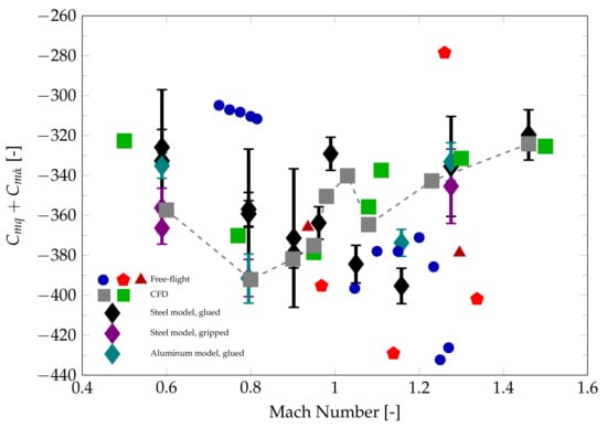 The pitch damping moment coefficient sum is a major factor for a projectile’s dynamic stability in flight []. Its knowledge early on in the design process is advantageous with regard to flight behavior and control system design. This is particularly true for flight at transonic Mach numbers where aerodynamic forces and moments can undergo significant changes for small velocity deviations.
