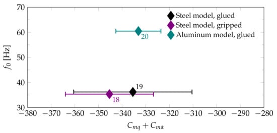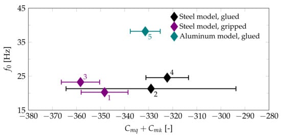 To better illustrate the influence of the different wire attachment methods and model material, the reference oscillation frequency is plotted over for the test cases at Mach 0.6 in Figure 12 and the test cases at Mach 1.28 in Figure 13. In Figure 12, some tests with the same model configuration but different wire tension forces are shown. For both wire attachment methods, the increase in tension force between the test cases shown is between 60% and 80%. It can be seen that this change only allows for a small modification of the wind-on oscillation frequency. Using the low-inertia aluminum model succeeds in increasing the oscillation frequency significantly. Given the size of the error bars, there is no clear evidence for an influence of the oscillation frequency or the wire attachment method on the stability derivative. The test cases 2 and 4 exhibit a significant difference in measurement error. A similar trend is observed at Mach 0.8 and 0.9. It appears that for this wire attachment method the tensioning force impacts the measurement error, but not the mean value for .