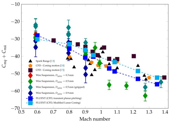 The results of the wind tunnel measurements for the ANSR test cases are shown in Figure 14 at different Mach numbers and compared to spark range measurements [] as well as computational results utilizing both the modified lunar coning method [,] and the transient planar pitching method.