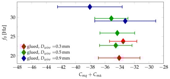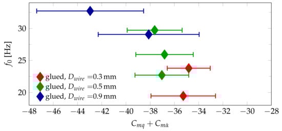The magnitude of both the stability derivative itself as well as of the absolute error values is much lower for the ANSR than for the Basic Finner. Thus the correction for the wire damping contribution, as described in Section 4.2, has a much higher impact. This allows an evaluation of the model using the test results obtained with different wire diameters in the subsonic range. Similar to Figure 12, Figure 15 displays the reference frequencies over the stability derivative for the seven different test cases at Mach 0.8 using the glued wire attachment method. For comparison, Figure 16 shows the same results without the wire damping correction. It can be seen that the correction accounts for less than 10% of the total aerodynamic damping if a wire diameter of mm or less is used. Due to the material damping behavior of the steel cables used for the tests at mm, is generally higher and not as smooth as the behavior shown in Figure 5. Thus the estimation of the model function is associated with larger uncertainties, leading to the larger error bars in Figure 14 and Figure 15 for these tests. Taking these errors into account, the wire damping model leads to a reasonable correction at Mach 0.6 and Mach 0.8, but not at Mach 0.9. This could be explained by the rougher surface texture of the cables causing the drag coefficient to deviate from the literature values of for smooth cylinders.