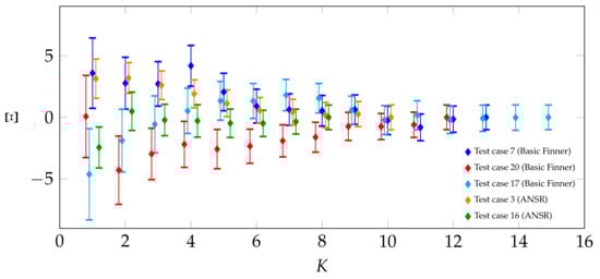 The statistical approach outlined in Section 4 results in well-converged mean values for . To further quantify the influence of the number of wind-on tests, the dependence of the mean and its standard error is analyzed. For selected test cases with N separate wind tunnel test runs, the evaluation is limited to K test runs with . In order to better compare different test cases, the results as well as the standard error of this partial evaluations are scaled using the results and of the respective full evaluations: