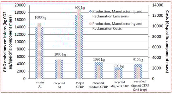 Figure 1 compares the GHG emissions and costs for virgin and recycled CFRP and aluminum components associated with the raw material production, manufacturing of the component, and reclamation (recovery) of the material through the selected recycling process. The component made of virgin CFRP demonstrated the greatest GHG emissions and the highest costs. That is mainly due to the environmental and economic impact of the production of the raw materials, especially the PAN fibers. The component made of virgin aluminum also demonstrated considerable environmental and economic impact, although reduced by approximately 20% compared with the virgin CFRP component. Recycled components demonstrated a considerable decrease in these values due to the fact that they do not require new raw materials, whose production is very intensive in terms of GHG emissions, energy, and associated costs. The most beneficial scenario concerns the CFRP component made of recycled aligned fibers, followed by the component made of aligned fibers which have undergone a second recycling loop.