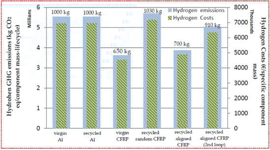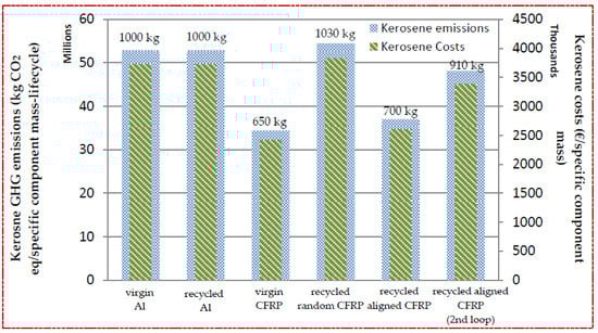 In Figure 2 and Figure 3, the use phases of CFRP and aluminum components (both virgin and recycled) are compared in terms of GHG emissions and costs, accounting for the two different fuels considered, i.e., kerosene and liquid hydrogen. To calculate the demonstrated values, a lifetime average distance of 50.4 million km was considered based on the Airbus A320 aircraft. The results are directly related to the weight of the considered components. As expected, in aircraft applications, the use phase dominates the life cycle impact of components in terms of their environmental emissions and costs (representing approximately 99% of the total emissions and costs of the life cycle). The use phase also remains dominant when using liquid hydrogen as a fuel, despite the fact that GHG emissions when using liquid hydrogen are almost 90% lower than when using kerosene. It should be noted that the above does not apply to less energy intensive transport sectors. For example, in the automotive sector, where a vehicle lifetime distance of approximately 200,000 km would be considered realistic, the environmental impact associated with virgin CFRP production nearly offsets the corresponding impact associated with the use phase. Therefore, utilization of a recycled CFRP component would clearly demonstrate benefit in this sector.