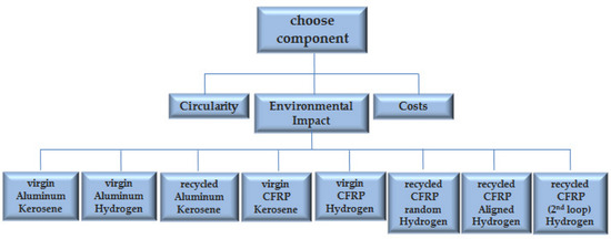 In the above context, when considering material selection from a wide range of potential options—especially in aviation—it is important to include a technical or quality feature in the evaluation phase, as the considered components present a design envelope with mechanical performance limits and specific manufacturing requirements [16]. The aim of the present study was to provide a decision support tool that can eventually assist decision-makers and relevant stakeholders to identify and select the best-performing materials that meet their defined needs and preferences, expressed through a finite set of conflicting criteria associated with technical, ecological, economic, and circularity aspects. The proposed tool accounts for the dependency of the impact of the material selection on the sustainability and circularity of an aircraft component or subsystem due to the type of fuel required. This is achieved through the integration of life-cycle-based metrics extending to both ecological and economical dimensions associated with the material and type of fuel used, as well as a suitable circular economy indicator (CEI) related to quality and focused on the material/component level. The aforementioned CEI has the advantage of considering the quality degradation of the materials after one or multiple recycling loops, addressing the notion that circularity cannot be adequately defined and assessed if it does not consider the degradation of materials over repeated recycling loops. Furthermore, the indicator is coupled with a multi-criteria decision analysis (MCDA) methodology in order to reduce subjectivity when determining the significance (i.e., weight) of the considered criteria in order to reach a decision. The novelty of the current tool lies in its ability to aggregate several metrics associated with sustainability and circularity aspects into a single index, and consequently simplify and rationalize the material selection process.