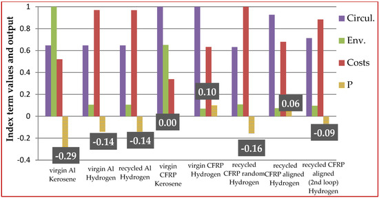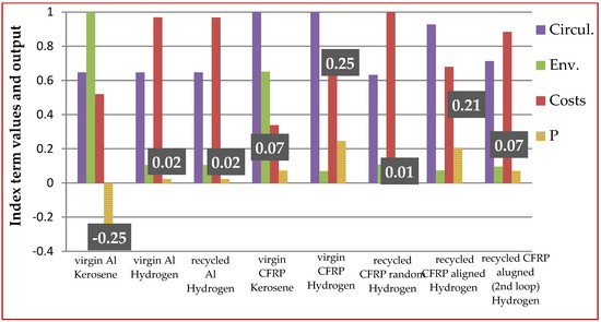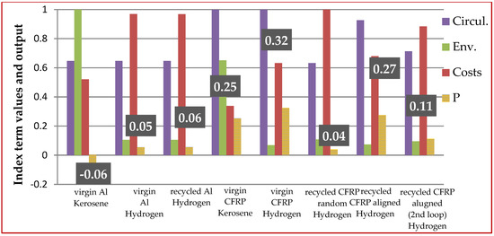 The calculated index values for the three different comparison analyses described above and the ranking among the considered components are shown in Figure 5, Figure 6 and Figure 7, representing the trade-off between circularity, environmental impact, and costs. The contribution of each of the three terms to the final P index value is also shown in each figure. Based on Equation (7), the CEI term was considered as a ‘bonus’, while the Environmental and Cost Terms were considered to be ‘penalties’ and therefore were subtracted from the Circularity Term. Hence, the higher the final value of the P index, the higher the overall performance of the component considered. In Figure 5, where the three criteria (circularity, environmental performance, and costs) were considered to be of equal importance, the best overall score belongs to the virgin CFRP component when hydrogen fuel was implemented. This is owing to its high quality, as well as to its low environmental impact during the flight phase due to its low weight compared with the alternative components. The recycled component composed of recycled CFRP aligned fibers follows in short distance, owing to its close-to-virgin quality allowing for potential reuse in high-performance applications. The virgin aluminum component, when kerosene fuel was considered, demonstrated the worst score by far—as was expected—due to its lower mechanical properties compared with composites, as well as the high environmental and economic impact associated with its use. Finally, the recycled aluminum components (for both kerosene and hydrogen fuel) presented similar index values to the CFRP component composed of randomly oriented fibers when hydrogen fuel was used.