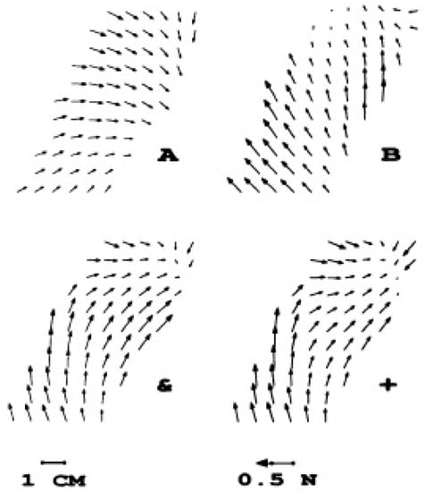 The most interesting discovery in the experiments concerning frogs was that the fields generated by activation on the spinal cord follow a principle vectorial summation. Simultaneous stimulation of two different areas of the spinal cord resembles the vectorial summation of the separate activation of each of these areas (See Figure 1) []. Generally, it is found that simultaneous stimulation fields and vectorial summations were similar in 87% of the experiments. As mentioned in [], the vector summation of force fields suggests that nonlinear forms of interactions among neurons and between neurons and muscles is more or less eliminated. With few force fields stored in the spinal cord, one may represent motor primitives using the superposition of spinal fields: