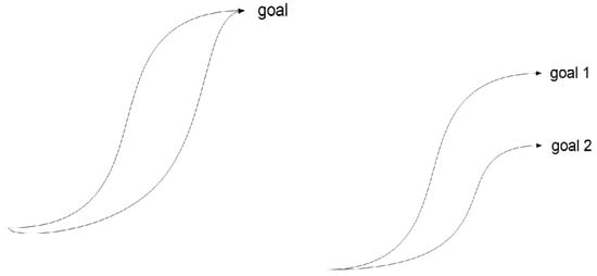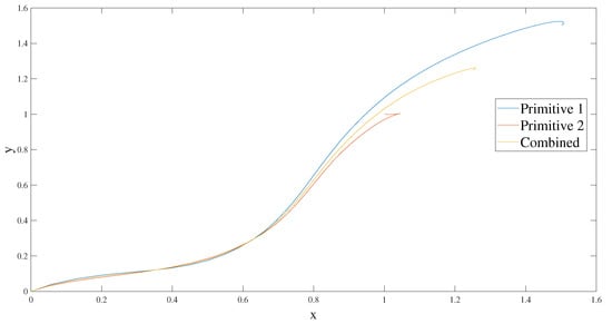 One can observe that the combination of system differential equations necessitates the combination of primitives. As a result, only the controlled section of differential equations is modified in Equation (10). Since DMP weights are designed linearly, a simple combination of weights is enough to achieve the desired results. In addition, primitives can also be combined serially. It was shown in [] that obstacle avoidance maneuvers can be divided into primitives. For this type of combination, it is also possible to modify DMPs using their own parameters.