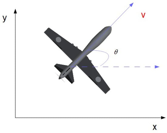 In this 2D model, x and y define the location of the UAV, and is the heading angle. The controller inputs v and w represent the air and angular speed of the UAV, respectively.