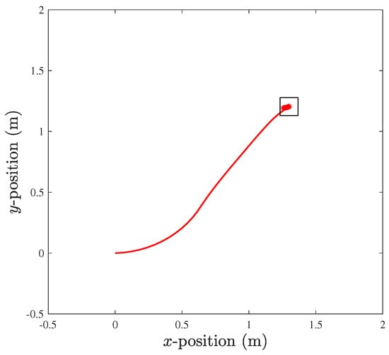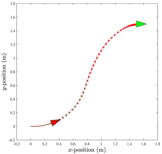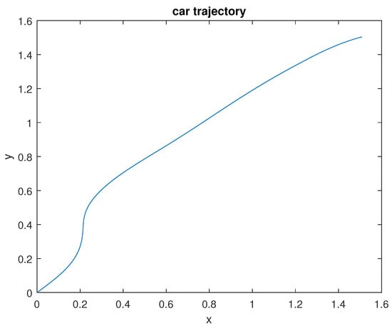 where and are the velocity state vector and weights, respectively. The constants , and are used for penalization. The terminal cost is shown as . The resulting trajectory for x and y is shown in Figure 10.