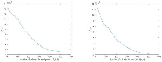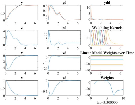 For application, the reinforcement learning software [] is used for a system with a kinematics model defined in Equation (34). For an initial primitive of a flight maneuver with an end point , the DMP imitated the trajectories generated by the MPC algorithm []. A total of 100 updates and 10 basis functions/weights was applied. For each update, 10 trials were used. We applied importance sampling in which the five best trials from the previous update were rerun in the next update. The cost function is: