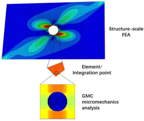 The GMC model is applied to each integration point of each finite element, and the strain states of each integral point are taken as the load input to the RUC, then the stress and strain states of each constitutive materials can be obtained according to Equation (16). The damage evolution and failure are evaluated at the micro-level, and after updating the stiffness matrix using the homogenization method, the multi-scale analysis will entry the next finite element iterative calculation. Figure 3 is a schematic diagram of the analysis process.