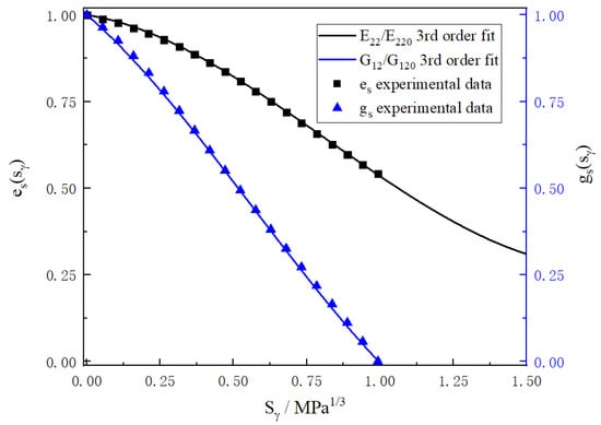 According to the experimental data of transverse elastic modulus E22 and shear modulus G12 corresponding to internal variable Sγ in literature [26], damage functions es and gs are obtained by cubic polynomial fitting, as shown in equations below. The coefficients are shown in Table 1. Figure 4 shows the polynomial es and gs obtained by fitting and the experimental data, respectively. The fitting effect is very ideal. The damage evolution rate of G12 is obviously higher than that of E22.