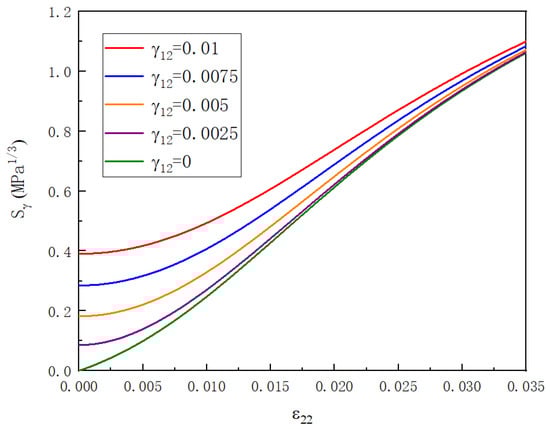 According to Equation (13), the value of Sγ depends on the strain state of the repeating unit cell, that is, it is determined by the transverse strain ε22 and shear strain γ12. Figure 5 show the changing curves of Sγ with ε22 in the interval [0, 0.035] when γ12 is selected to be 0, 0.0025, 0.005, 0.0075, and 0.01. It can be seen that the positive solution of Sγ is unique and monotonically increasing. The growth rate increases first, then decreases, and finally flattens out. The values of Sγ are between 0 and 1.2.