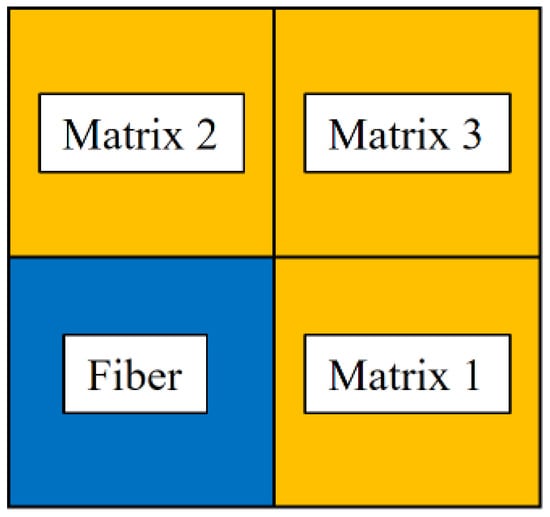 The micromechanical GMC model can capture the interaction between the constituents of composite materials, and can easily analyze the damage or failure of fiber and matrix phases independently. Each material point in the finite element model corresponds to a 2 × 2 RUC [21], as shown in Figure 6, containing one fiber subcell and three matrix subcells. The fiber volume fraction of T800/3900-2 lamina is 0.6, and its properties of fiber and matrix constituents are shown in Table 2 and Table 3.