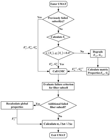 Due to the different stress-strain states of each matrix subcell at the same material point in the analysis process, the damage evolution rates of different matrix subcells are different. In order to keep the same as the damage limit 0.4 of lamina level E22 and G12, the matrix subcell material with damage evolution dropping to 0.4 earlier stops, degrading until the last matrix subcell reaches the degradation limit, which represents the final matrix failure of the RUC. The flow chart of multi-scale analysis algorithm based on a four-subcells GMC model is as shown in Figure 7.