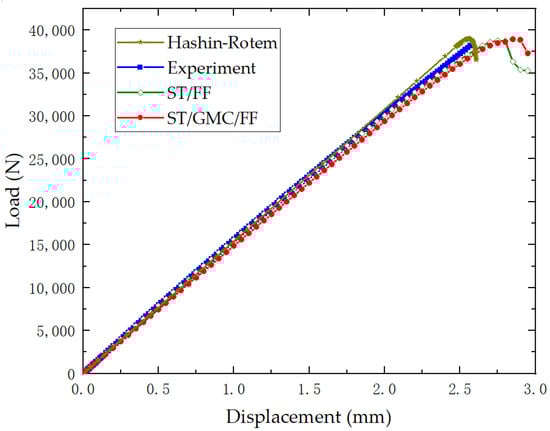 The three methods implemented using the subroutine UMAT introduced in Section 2 above are used to conduct the finite element analysis of the open-hole laminate specimens. The S4R mesh type is used, and the mesh is refined around the open hole. The composite constituents properties can be seen in Table 2 and Table 3, and the laminate properties are shown in Table 4. Additionally, the tensile and compressive strengths of the composite laminate are 2690 MPa and 1380 MPa, respectively, which are provided by vendors and used to perform FEA at the micro-level. The finite element model is restricted from moving in the thickness direction and all the in-plane rotational degrees of freedom to account for plane stress simulation. The left end of the model is fixed and the right edge is constrained in the transverse displacement and all rotations, then a tensile displacement of 5 mm is applied to the right end. The load versus displacement curves obtained from the three progressive damage methods are shown in Figure 10. It can be observed that the ultimate load prediction for ST/FF (38.76 kN), Hashin-Rotem (39.49 kN) and ST/GMC/FF (38.93 kN) agree well with the experimental value (38.45 kN). The load displacement curve obtained by Hashin-Rotem progressive damage method is linear, but both ST/FF and ST/GMC methods achieve satisfactory nonlinear reduction before the displacement-load curve reaches its peak. The load displacement curve obtained in the experiment has shown, to some extent, nonlinear behavior, especially near the end of the experimental curve. In the experiment, the crack initiates around the open hole and propagates rapidly to the edge of the specimen. It is not possible to capture the rapid progression of the crack by using the implicit solver, so the gradual failure of fiber and matrix yield the exhibited softening in the ST or ST/GMC model.