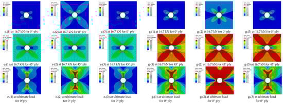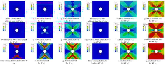 Figure 11 shows the fiber damage and matrix nonlinear damage state of 0° layer and 45° layer under different loads by ST/FF method. As the damage states of the −45° layer and 45° layer are basically symmetric with respect to the 0° axis, the damage contour of 0° layer and 45° layer are selected to be shown below. At 80% ultimate load, tensile and shear damage begin to fail at the upper and lower edges of the open hole, while no element in the transverse direction reaches the maximum failure value for 0° layer. Under this load, a small number of elements have failed in the transverse direction and more shear failure are presented around the open hole for the 45° layer, but no fiber failure occurs in this layer. At 90% ultimate load, the fiber failure, the progressive degradation of transverse and shear moduli for 0° layer and 45° layer all continue to extend. When reaching the ultimate load, all damage contours of 0° or 45° layer have spanned the width of the specimen except for the fiber failure of 45° layer, after which the crack propagates rapidly until most of elements around the open hole are failed. It can be observed the degree of damage for shear modulus are greater than that of transverse modulus in both 0° and 45° layers, which is consistent with the theoretical model shown in Figure 4 above. The final damage patterns of 0° or 45° layer are in agreement with the experimental results, which proves that the prediction of failure mode is reliable.