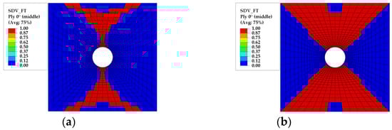 As shown in Figure 13, the damage state of 0° layered fiber subcells is similar to the damage contour obtained by ST/FF method, in which the failure starts from the elements at the upper and lower edges of the hole and expands along the oblique crossing direction, until it runs horizontally through the finite element model. Because the RUC model used contains only one fiber subcell, the failure of the fiber subcell means the fiber failure for the whole RUC at the finite element scale.
