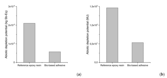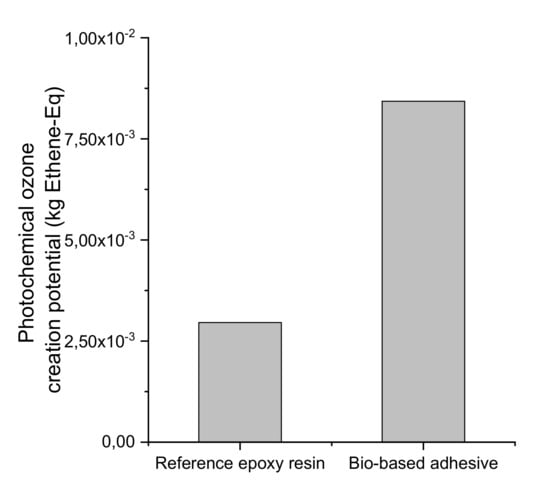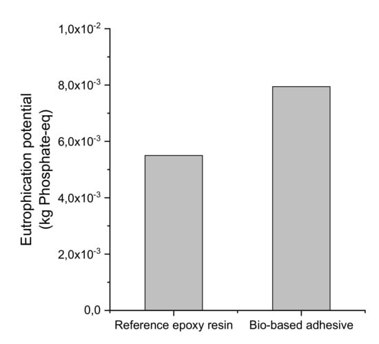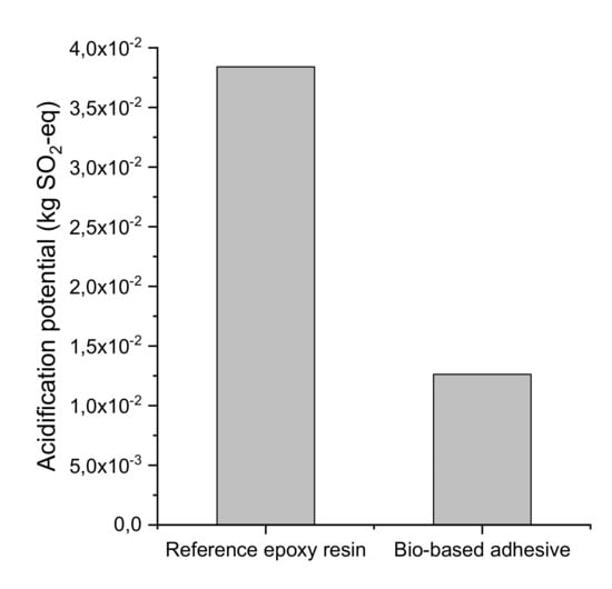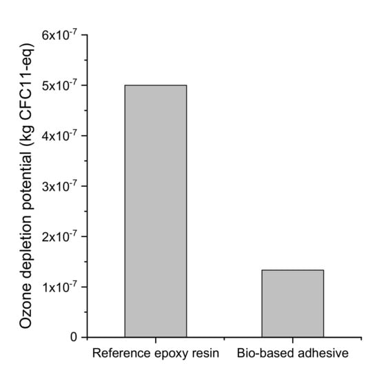 Efforts are recently being made to break down and recover the monomers that make up an epoxy resin, once it has been hardened, by various chemical treatments [,,]. However, the most promising technique is that of the extensive hydrolysis [,], in which no chemicals harmful to humans and the environment are used. In this way it is possible to recover the monomers of an epoxy resin and reuse them. It is therefore vital to compare the environmental impacts of the production of an epoxy petroleum-based resin (as a reference resin) with the environmental impacts of the production of a bio-based resin (epichlorohydrin/cardanol adhesive) in order to draw conclusions about the environmental impact of the novel bio-based adhesive.