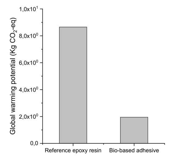 Comparison of GWP between the neat bio-based adhesive and the reference epoxy in terms of CO2 emissions.