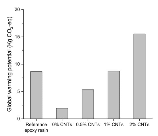 For the purpose of this research and the study of the environmental impact of the nano-reinforced resin, results from the literature were used. In particular, for the carbon dioxide emissions for carbon nanotubes, the data of carbon nanofibers were used as they have a similar method of preparation and similar environmental effects [,,,].