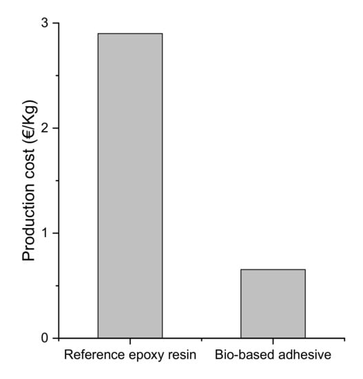 An important parameter for the extensive use of the bio-based adhesive is the production cost compared to a common epoxy resin. The production cost of the adhesive is a function of the energy used to produce it. The cost of 1 kWh can be considered equal to 0.114 euros []. The energy of adhesive’s production in kWh can be considered equal to 0.34 kg CO2/kWh []. Based on the global warming potential in kg CO2 emissions, the production cost of the reference epoxy resin was calculated compared to the bio-based one according to the following equation: