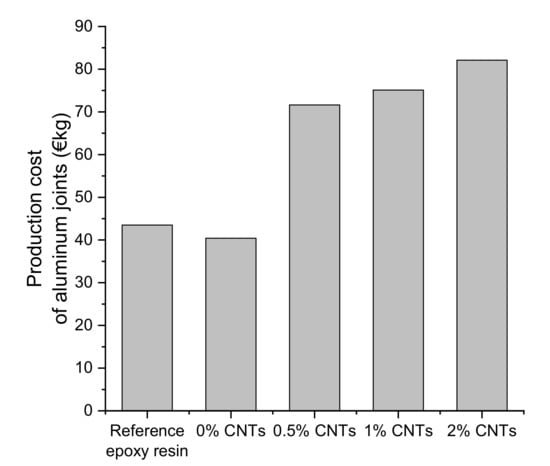 As shown in Figure 8, the production cost of the bio-based adhesive (0.65 €/kg) is lower by 77% than the production cost of the reference resin (2.9 €/kg). Furthermore, Figure 9 compares the production cost of the aluminum adhesive joints bonded with the neat, the nano-filled bio-based adhesive and the reference epoxy resin. As can be seen, whereas the joints bonded with the neat bio-based adhesive has a lower cost than the joints bonded with the reference epoxy resin, the addition of CNTs increases the cost of the joints significantly. With increasing the content of the CNTs from 0.5 to 2%, the production cost of the aluminum joints compared to the cost of the reference epoxy resin increases from 44 to 51%. The deviation in the comparison of the cost of materials (Figure 8) and the cost of the joints (Figure 9) is attributed to the application cost. Specifically, there is an increased cost in the production of the joints in the present work compared to [] due to the low degree of automation, and the higher application of human-driven processes.