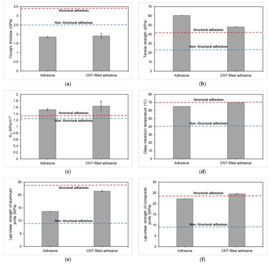 Comparison of mechanical properties of the neat and CNTs-filled bio-based adhesive with the average properties of structural and nonstructural (cosmetic) adhesives. (a) Young’s modulus: five specimens were tested, (b) tensile strength: five specimens were tested, (c) KIC: three specimens were tested, (d) glass transition temperature: one specimen was tested, (e) lap-shear strength of aluminum joints: five specimens were tested, (f) lap-shear strength of composite joints: specimens were tested.