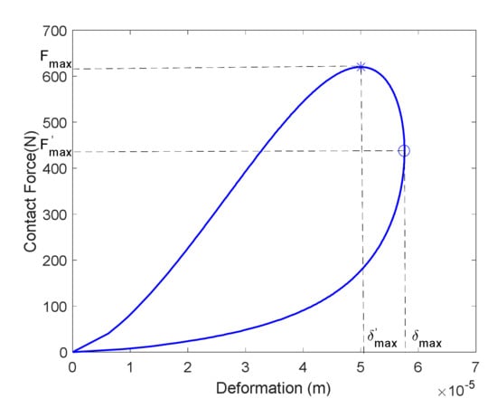 However, different from the basic Hertz model, in which the maximum contact force occurs at the maximum deformation, the calculation of the maximum contact force of the Hertz damping model is more complex. Figure 3 shows the curve of the contact force with respect to deformation, where and the Gonthier et al., model of the hysteresis damping factor is adopted. The marker “” represents the maximum-contact-force point with coordinates (,), and the marker “o” represents the maximum-deformation point with coordinates (,). It can be seen that the maximum-contact-force and maximum-deformation points are not consistent.