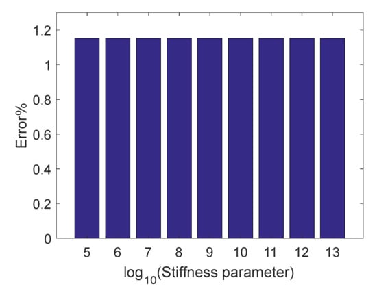 Therefore, assuming that both the kinematics parameters and dynamics parameters of the space robot and target are determined, is only related to the contact stiffness parameter , restitution coefficient , and initial relative contact velocity . is proved to be unaffected by and , as shown in Figure 4 and Figure 5, and becomes increasingly smaller as increases, as shown in Figure 6.
