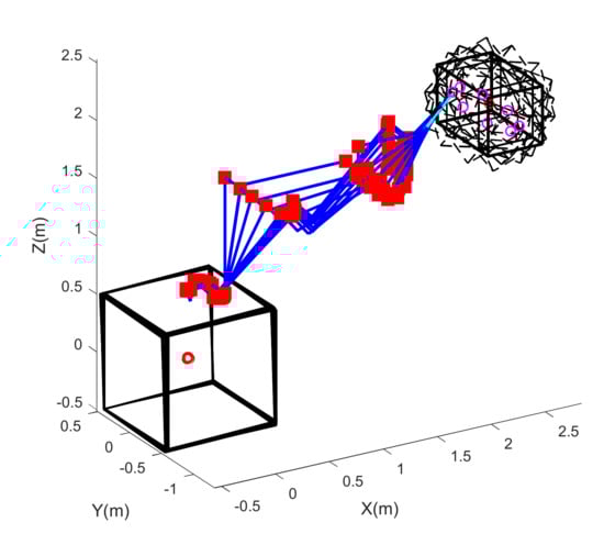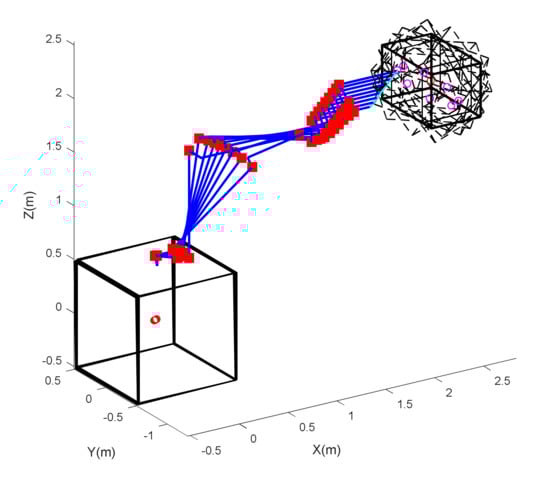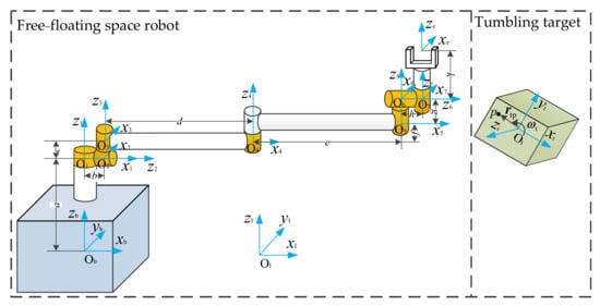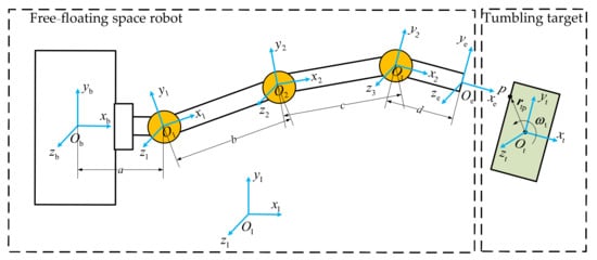 A 3-degree-of-freedom (3-DOF) free-floating space robot is studied and shown in Figure 7 with a = 0.6 m, b = 1.4 m, c = 1.6 m, and d = 0.5 m. and are both expressed in the target coordinate frame. The dynamics parameters of the space robot and target are listed in Table 2.