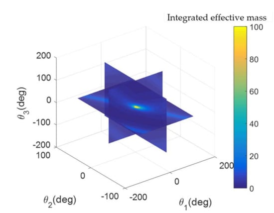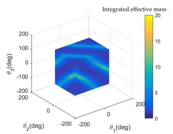 Figure 9 depicts the slice map at , , and . It can be seen that the maximum value of integrated effective mass occurs at and it is the exact configuration when the robotic arm is fully deployed. Several researchers proposed to use “straight arm” to capture a target with the purpose of reducing the base disturbance []. According to its definition, this fully deployed state is one case of the “straight arm”; however, the space robot and target may suffer a very large contact force as stated above.