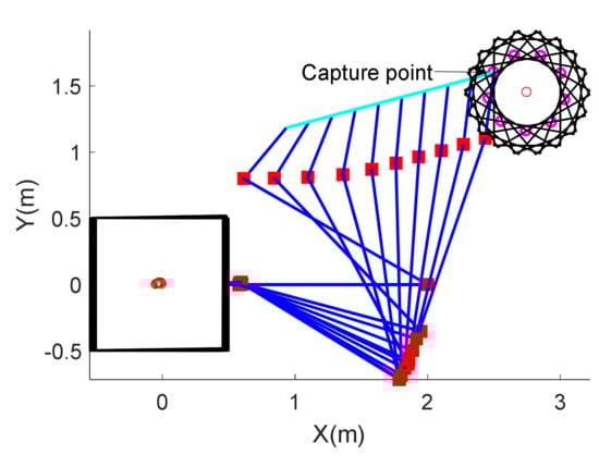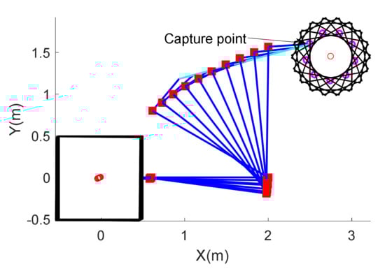 The straight-line trajectory following of the end-effector is assumed to be required in the task, the initial configuration is and the total task time is 180 s. Figure 10 shows the capture process of a 3-dof space robot without optimization and Figure 11 shows the capture process optimized by the gradient-optimization method in null-space that has been proposed. It can be seen that a space robot can realize the trajectory following and reach the capture point in time in both capture processes, but with different capture configurations. The simulation comparison results are listed in Table 4. Through optimization, the integrated effective mass is decreased by 77.50% and the maximum contact force is decreased by 57.86% accordingly.