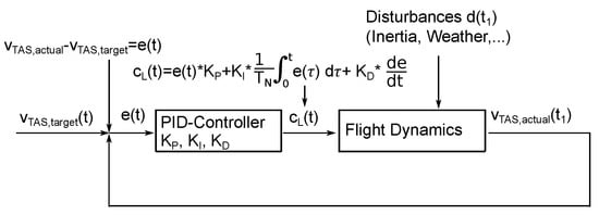 SOPHIA’s control loop. To control true airspeed , the lift coefficient is employed as a regulative variable. The parameters , , , and the reset time are affected by aircraft type and mass and flight phase.