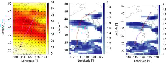 Lateral paths of flight CSN6273 from ZYHN to ZGSZ. Left: yellow-red colour scheme indicates wind speed in knots. Middle and right: blue areas indicate ice-supersaturated regions. The real path (Scenario 1, rose) makes a detour of 7% and a contrail is induced during another 30 min of flight time (85 min, compared to 55 min in the path-optimized scenario).