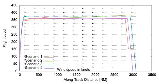 Several optimizations with different objective functions were carried out. Although in Scenario 2 the vertical profile was optimized purely aerodynamically, in Scenario 3 the vertical profile was optimized taking into account the current wind conditions along the historical lateral path. Finally, in Scenario 4, both the lateral path and the vertical profile were optimized multi-criteria and a cost minimum of direct operating costs and environmental costs was achieved.