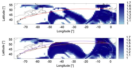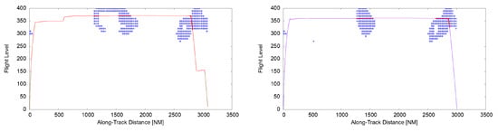 In Scenarios 2 and 3, the historic lateral path is taken as an input variable, respecting today’s operational procedures, where deviations from the filed lateral path are only possible for specific reasons, such as weather-induced detours or directs [9,71]. However, the highest optimization potential is naturally achieved in a four-dimensional trajectory optimization, in which not only the speed and the vertical profile but also the lateral path are adapted to the current wind conditions. In Scenario 4, we are searching for an optimal lateral path on all possible flight levels between FL320 and FL410 with , then we use SOPHIA to calculate the flight performance along each optimized path FL320 and FL410 and the respective cruising altitude, and finally, we save the trajectory with minimum fuel burn. Although in this scenario we do not allow SOPHIA to have a CCCO, at high given flight heights a vertical profile similar to the CCCO is created with a long climb phase with maximum thrust.