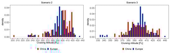 This is a continuation of a similar study of representative single trajectories in Chinese and European airspace [8] where the HFE was in focus of the study. The operational constraints of the Chinese and European air traffic systems, as well as the optimization potential of vertical flight efficiency and horizontal routing in the upper airspace, have been analyzed and compared in this study between two airspaces that are outwardly very similar (in terms of size, number of aircraft movements, number of airports, and distances between airports as described in Section 2.3). At cruising altitude, both airspaces have similar basic meteorological conditions without weather-related disruptions. From a meteorological point of view, cruising in China and Europe should be relatively unrestricted.