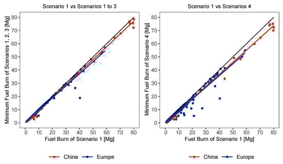 Four-dimensionally defined input variables (e.g., 4-D wind conditions) and maybe multi-criteria target functions convert aircraft trajectory optimization into a nonlinear optimization problem. From this follows (as already seen in the analysis of single flights), the impact of a purely vertical trajectory optimization on fuel efficiency is limited when sticking to an old lateral flight path. The fuel burn calculated in Scenario 4 is compared with the historic fuel burn and is used to calculate the optimization potential of Scenario 4 in China and Europe. Figure 12, right indicates the decrease in fuel burn, compared to the historic scenario in a shallower slope of the regression lines and some large differences between historic and optimized fuel burn for a few European data points.
