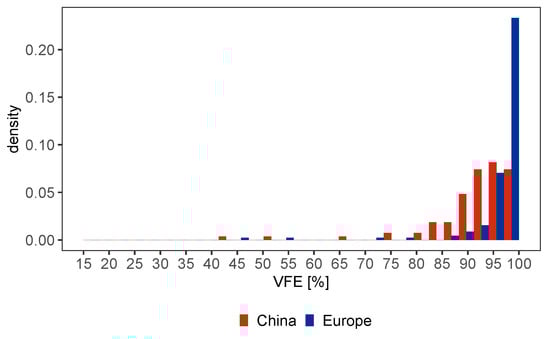 Histogram of VFE (Equation (1)) between historic and minimum-fuel flights (Scenario 2 or 3) in China and Europe. Here, a constant lateral flight path is used.