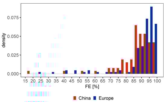 The FE shows a stronger dispersion in both regions than the VFE (see Figure 14 and Table 10). It also follows that weather has a strong influence on individual trajectories, whose efficiency can be eminently improved by path adjustment (compare also with Figure 12). The even stronger difference between China and Europe, already discussed in Figure 12, also becomes clear here. Considering the additional fuel savings due to the lateral path optimization, the FE of the historic flights decreases to values below : and . It follows that in China, on average, just under fuel could be saved through optimal vertical and horizontal routing. In Europe, the figure is a good .