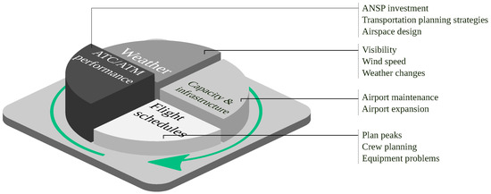 More extensively, the Civil Air Navigation Services Organisation (CANSO) considers interdependencies within air traffic management (ATM) [28], p. 14. Accordingly, causal reasons for inefficiency can often be attributed to the air navigation service provider (ANSP). However, there are certain operational performance areas that may in turn influence an air navigation service provider (ANSP), and others that are influenced by stakeholders outside the air navigation service provider (ANSP). Figure 2 shows some of the system dependencies that exist in developing a key performance indicator (KPI) for delays. With appropriate data, an air navigation service provider (ANSP) can measure how well available capacity was used and how flexibly more direct routings might have been provided. The overall efficiency of the flight, as measured by an ideal flight, is further influenced by airport infrastructure, weather conditions, and flight schedules. There are additional sources of influence not considered here.