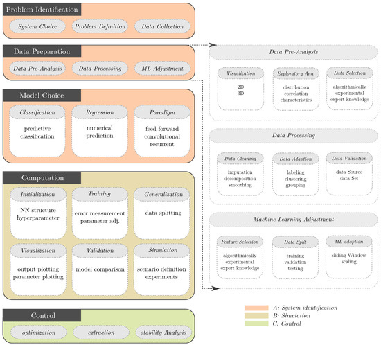 All parts of the system identification process are essential for a purposive training of an ANN considering different characteristics of the data and the analysed (sub-)system. The target for the chosen system itself is described in A1, followed by an extensive exploratory data analysis in A2, which leads to the choice of suitable ANN structures in A3. In the computation part, system identification and simulation overlap, as the training is essential to build the mapping from inputs to outputs and use it to forecast different scenarios and problems in the simulation part (B) (cf. Section 3.2). Control (C) closes the framework, as it enables the extraction of knowledge from the ANN and the analysis of its stability, ensuring it is usable for optimization (cf. Section 3.3).