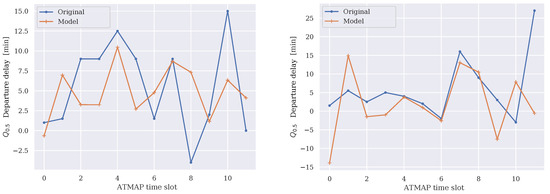 Prediction using known input quantities involves estimating how the virtual air traffic management (vATM) will behave in the future based on the section of the air traffic management (ATM) under consideration. Example input sets are shown in Figure 8. The predictions of -Departure (DEP) delay for two days in Hamburg Airport (HAM) using flight schedule data and air traffic management airport performance (ATMAP) are shown. This form of ANN application is associated with high uncertainty and is based on the learned correlations, which were validated within the learning process. The process of prediction is one of the central areas of interest in Artificial Intelligence (AI) and receives much attention scientifically—especially for RNN/LSTM structures [38,39,40].