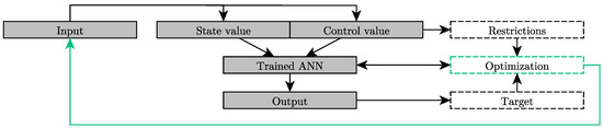 The control (Section 3.3) involves deriving recommended actions from the trained ANN. The vATM is applicable from a previous theoretical system identification, but is intrinsically unknown. (The computational processes within a neural network are, to date, only comprehensible for simple networks, which is why the vATM turns into a functioning but intrinsically unknown black box at this point). Due to the complexity of multi-step ANN, the methods used for mathematical evaluation are metaheuristic in nature and involve black-box optimization, for which the ANN serves as a cost function. For multi-step optimizations (in a consideration space larger than ), feedback of the system must be captured which map restrictive changes in the inputs. Similarly, this scope captures the theoretical transfer from an ANN to the form of a control structure, which can be studied with theories of dynamical systems considering the ANN parameters.