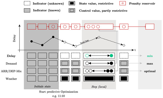 According to (1), the state of the system does not change without a time component, and according to (2), state changes build on each other (cf. ). Training ANN aims at approximating according to the chosen KPI. All time series based on the concepts of performance evaluation reflect a discretization of the operational processes of ATM. These processes are continuous in nature at their origin. A collection of performance values, e.g., via defined KPI, results in time series at discrete intervals t, which allow a successive, but not continuous, representation of the respective system, which is why the definition is followed for the investigation [36].