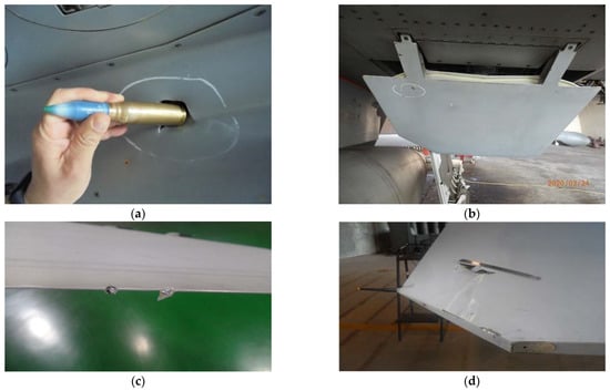 Some recent cases of aircraft self-collisions are shown in Figure 1, including the damages caused by gun shell case collisions (Figure 1a,b), as well as collisions of clips used for a general-purpose bomb (Figure 1c) and a fin separated from a missile (Figure 1d) with horizontal stabilizers. A brief description of each case is provided in this section.