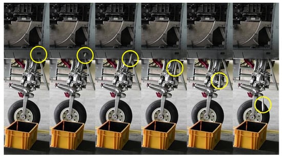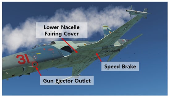 Modern fighter aircrafts are equipped with guns, which comprise a head and a case in a shell. After firing, the shell cases are removed from the guns and stored inside the aircraft or are ejected outside. The disposal of these cases outside the aircraft is reasonable from an engineering design perspective considering the restricted space in the nose section of the aircraft, where the guns are located. However, the ejected shells may collide with the external stores and damage the aircraft due to the significant variance in the ballistic trajectories. Photographs and videos of ejected shell cases show fast rotation and considerable variation in the vertical displacement [15]. Figure 1a,b shows the damage caused by the ejected shell cases of an F-5 fighter aircraft. Figure 1a shows the puncture on the lower nacelle fairing cover, and Figure 1b shows a scratch on the left speed brake. The initial conditions that determine the trajectories vary as a shell case passes through a long, curved passage before ejection. Shell case rotation occurs as the shell case is an unstable, aerodynamically blunt body.