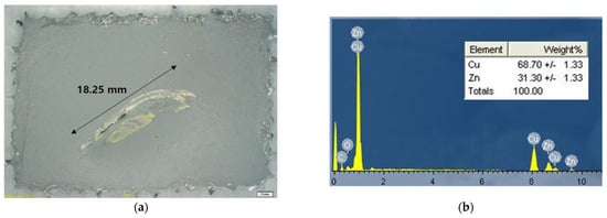 Damage was discovered during a post-flight inspection of the lower nacelle fairing cover below the left air intake and speed brake (Figure 2). In particular, puncture damage on the lower nacelle fairing cover and a scratch on the speed brake were observed (Figure 1a,b, respectively). The most recent incident occurred during an air-to-ground firing drill. The pilot reported that the aircraft velocity was 450 knots, and the dive angle was 25–28°. The chemical composition of the damage to the nacelle fairing cover was analyzed using energy dispersive spectroscopy. Copper and zinc were the primary foreign elements, with a ratio of 7:3, respectively (Figure 3). Additionally, the case was fabricated using brass.
